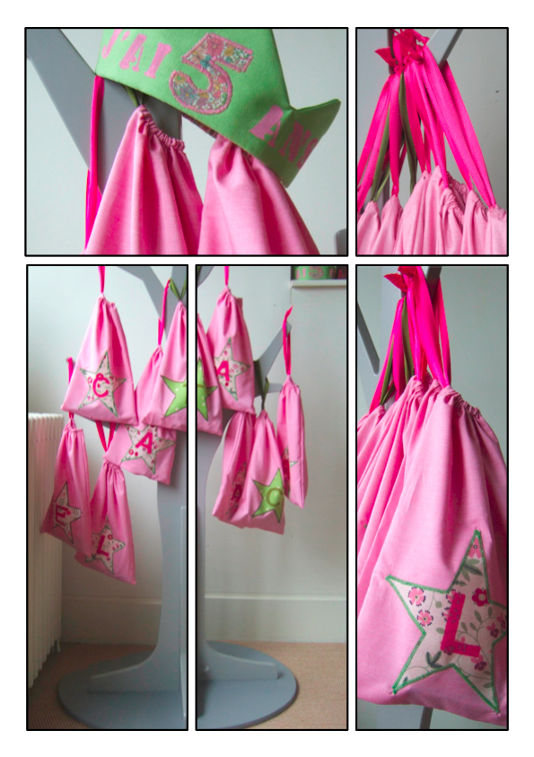 Ca y est, l’anniversaire est passé. La demoiselle était ravie. Et pour remercier ses amis (il y avait 2 gars qd même), chacun est reparti avec un sac estampillé de son initiale !