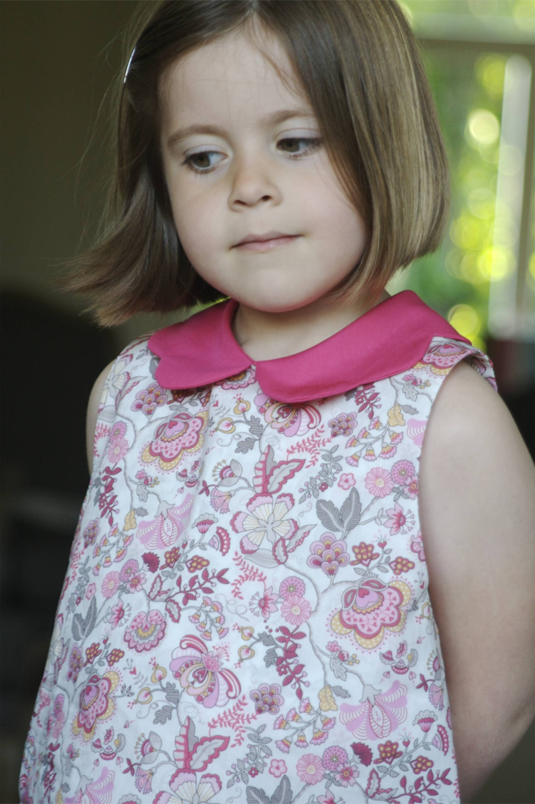 Les plants de pivoines sont en fleurs, les tuniques aussi !  Premier col pétale… et je ne suis pas déçue du résultat. La demoiselle partage d’ailleurs mon avis. Elle ne veut plus la quitter et se prête bien au défilé.