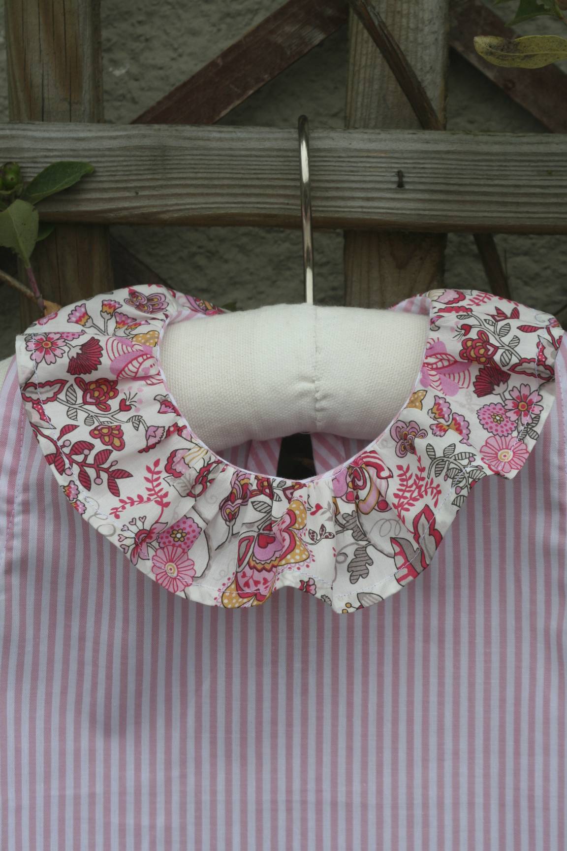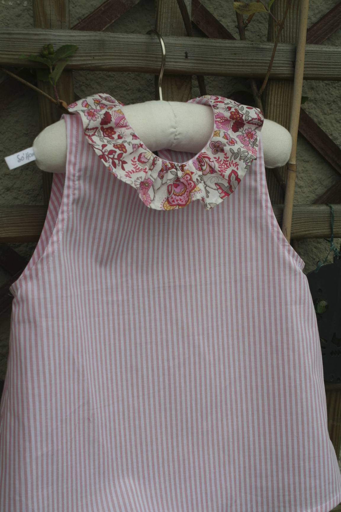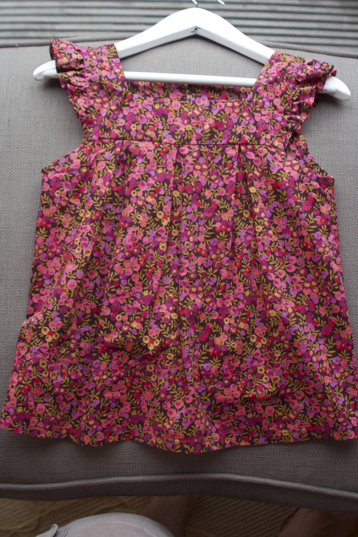 Et puis une dernière tunique : le modèle d’une robe nina, modifiée d’un peu partout (encolure, doublure, fermeture…) . Réalisée aussi en rayé violet et liberty tatum, mais la photo est prisonnière de mon appareil photo !