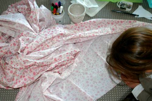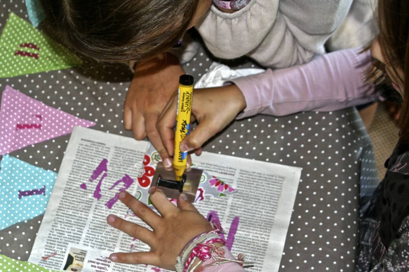 Les vacances d’été font bel et bien parti du passé ! Mes jeunes apprenties couturières sont de retour pour leur atelier couture du samedi matin. Premier projet de l’année : fabriquer de A à Z une banderole en tissu. Choix du tissu, coups de ciseaux, pochoirs et peinture pour imprimer le nom choisi, nous n’avons pas eu le temps de toucher à nos machines à coudre. L’assemblage aura lieu lors de la prochaine séance.