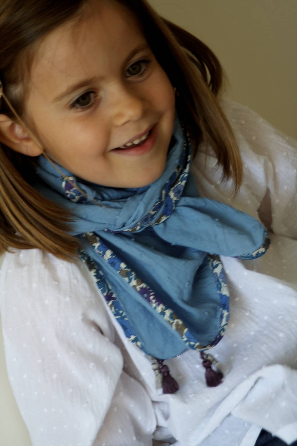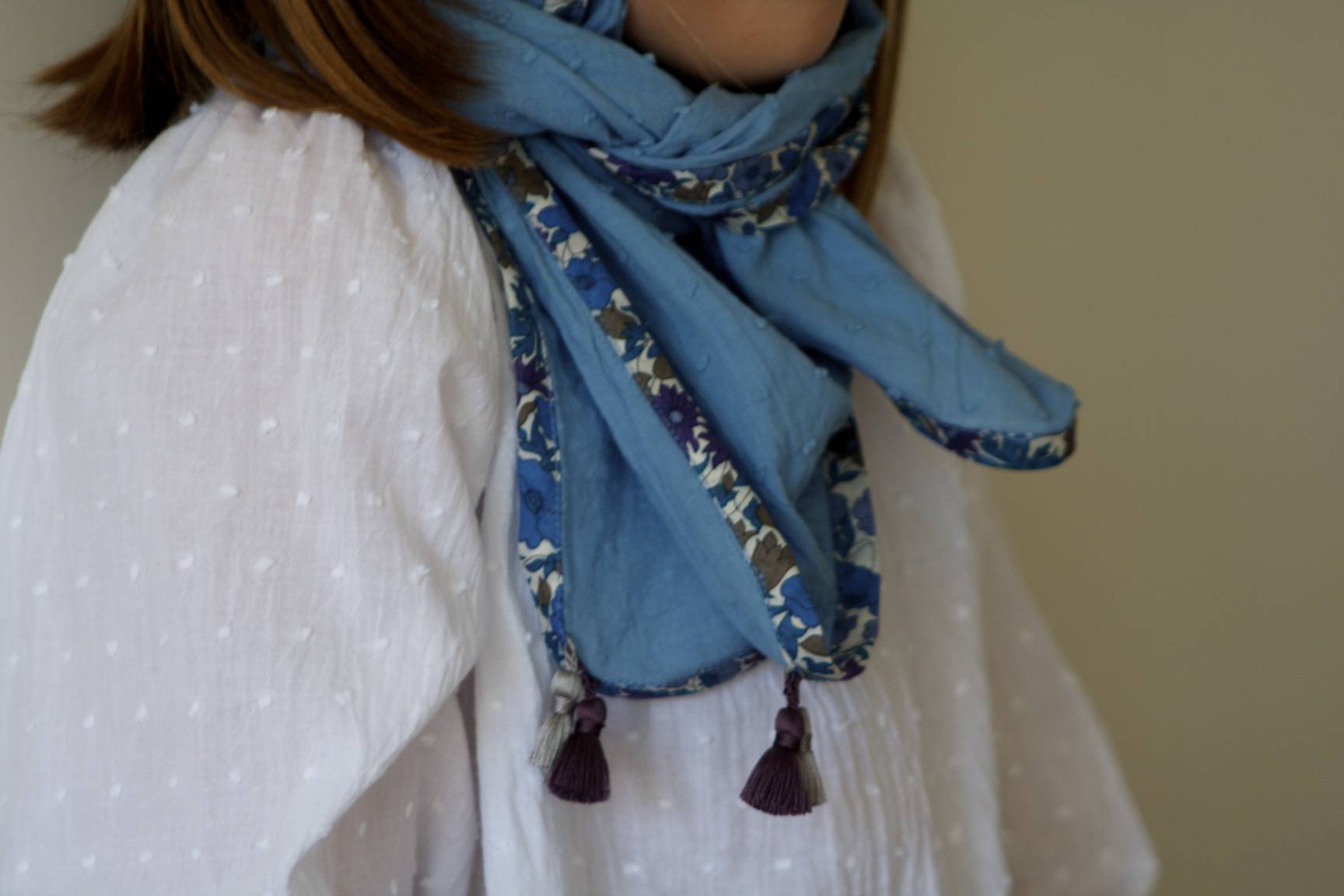 J’ai continué avec une autre version de ce coton plumetis : en bleu cette fois, bordé d’un biais poppy and daisy, un foulard que la demoiselle apprécie beaucoup !