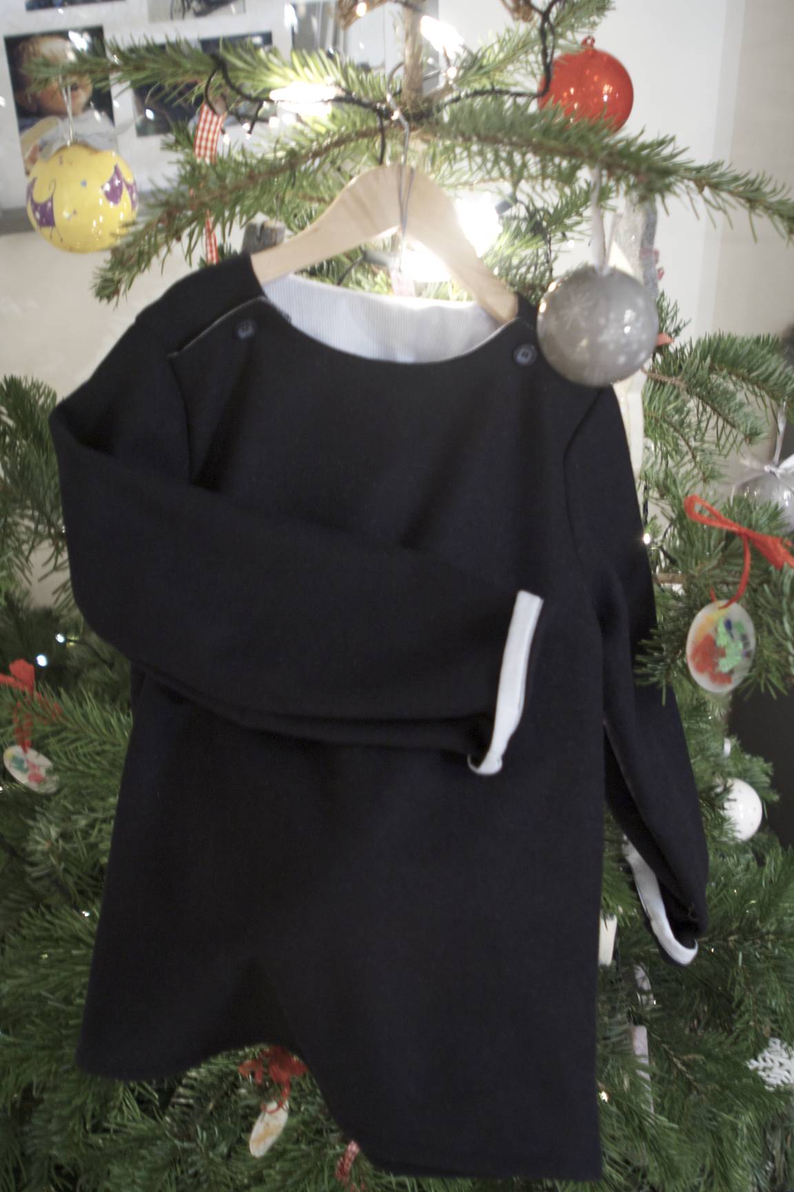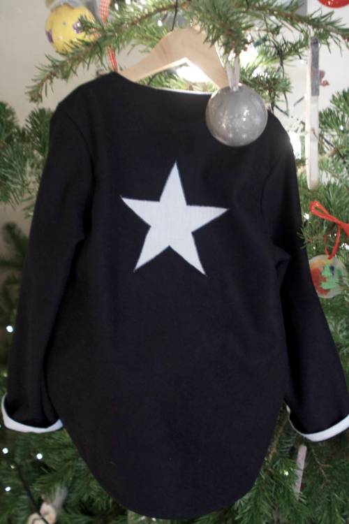 Bon, les garçons aussi doivent être biens couverts par les temps qui courent. Une blouse en lainage bien chaud, était accrochée au sapin. J’ai quelque peu tardé à la montrer, mais les températures rendent cette version du patron bien d’actualité. Mr Méli-Mélo Jr en a une en bleue marine… et une autre en lainage marron, toutes deux avec une étoile en tissu appliquée dans le dos pour avoir la tête dans les étoiles !