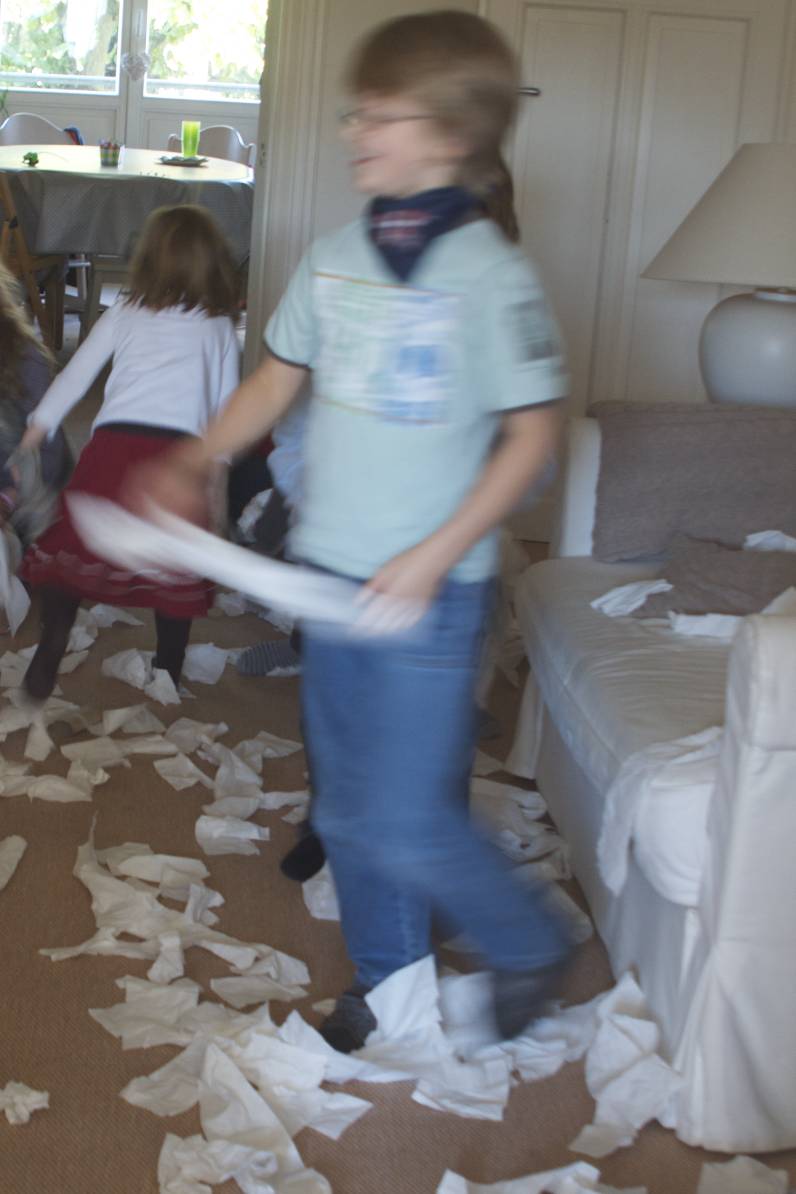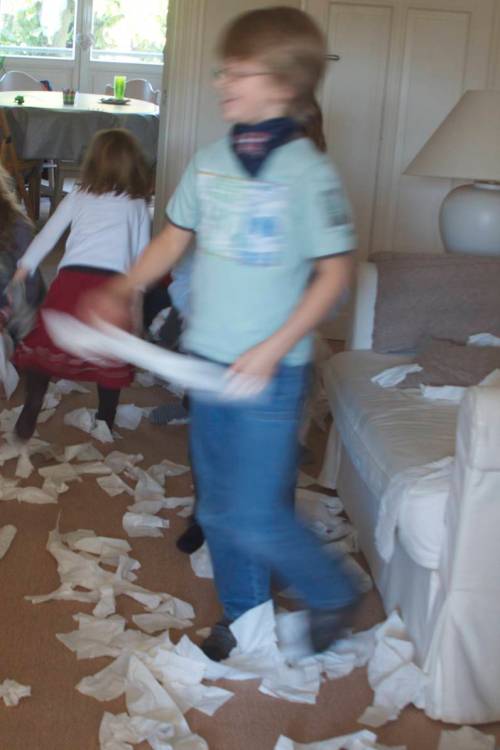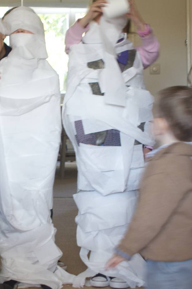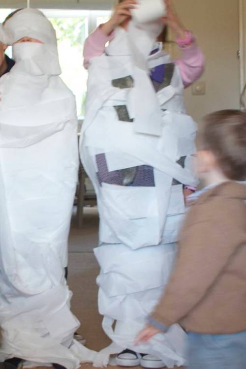 Une nouvelle mode pour habiller en un éclair les enfants le matin ? Style momie, en papier toilette. Même pas besoin de répéter qu’il faut s’habiller. Une seule fois suffit, surtout si l’on fait la course !