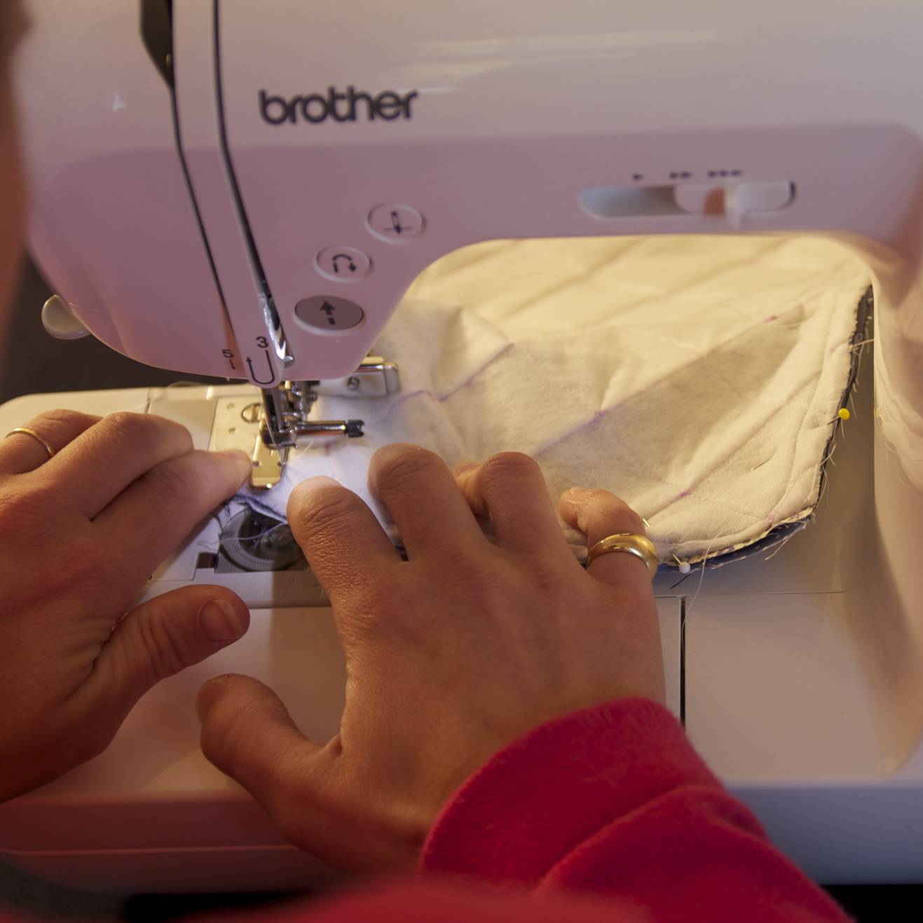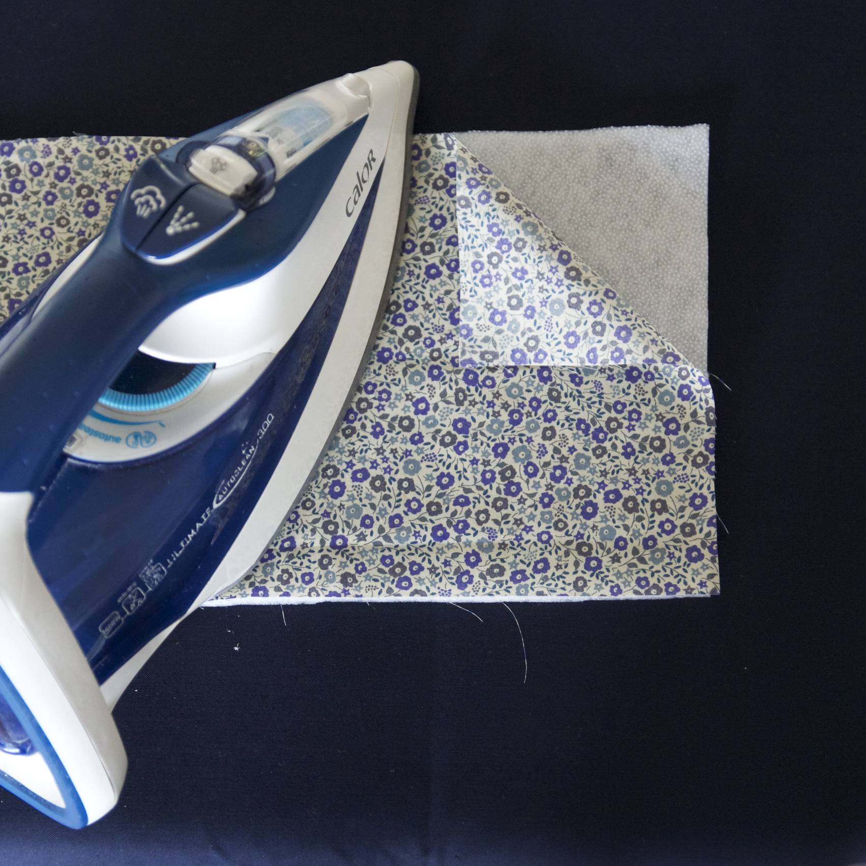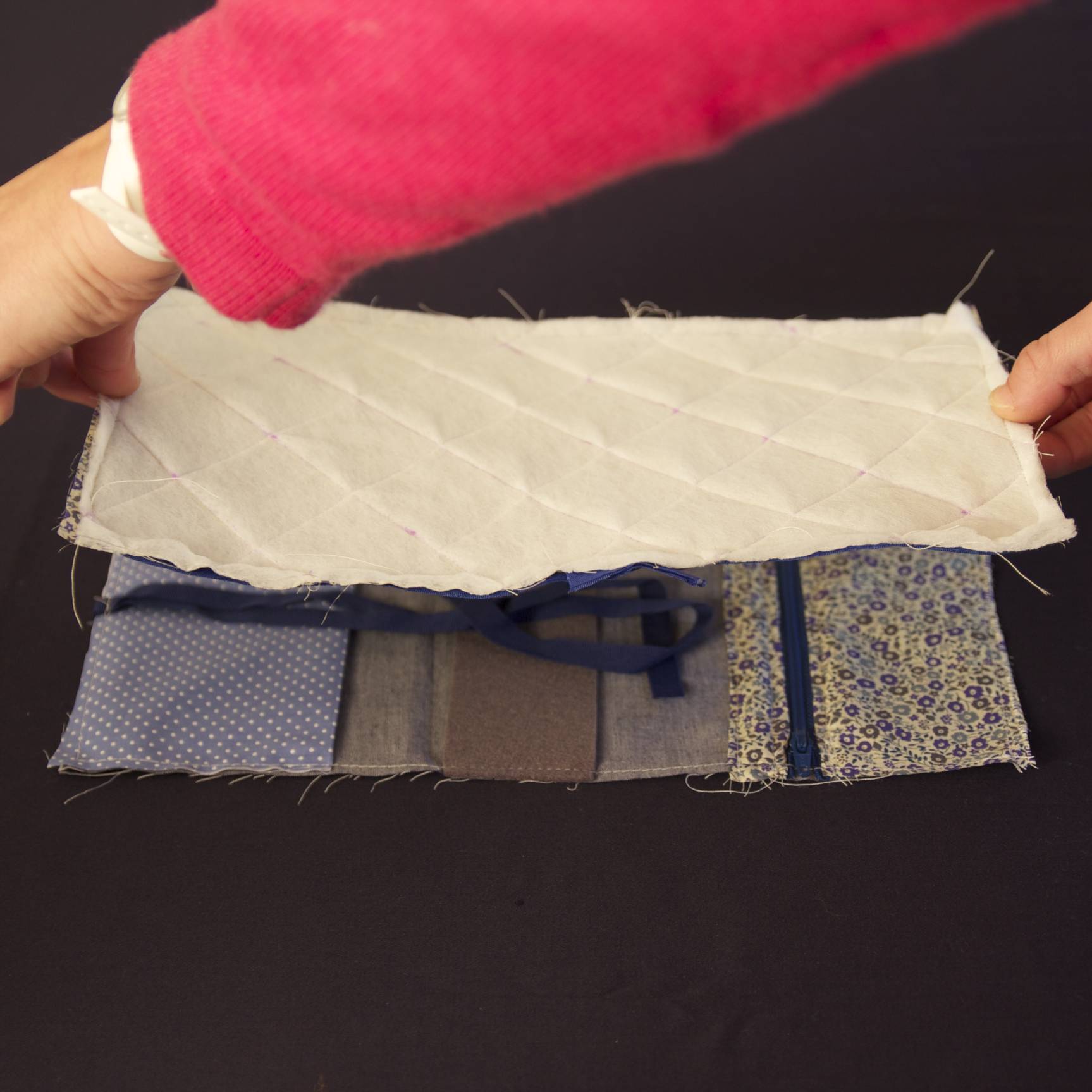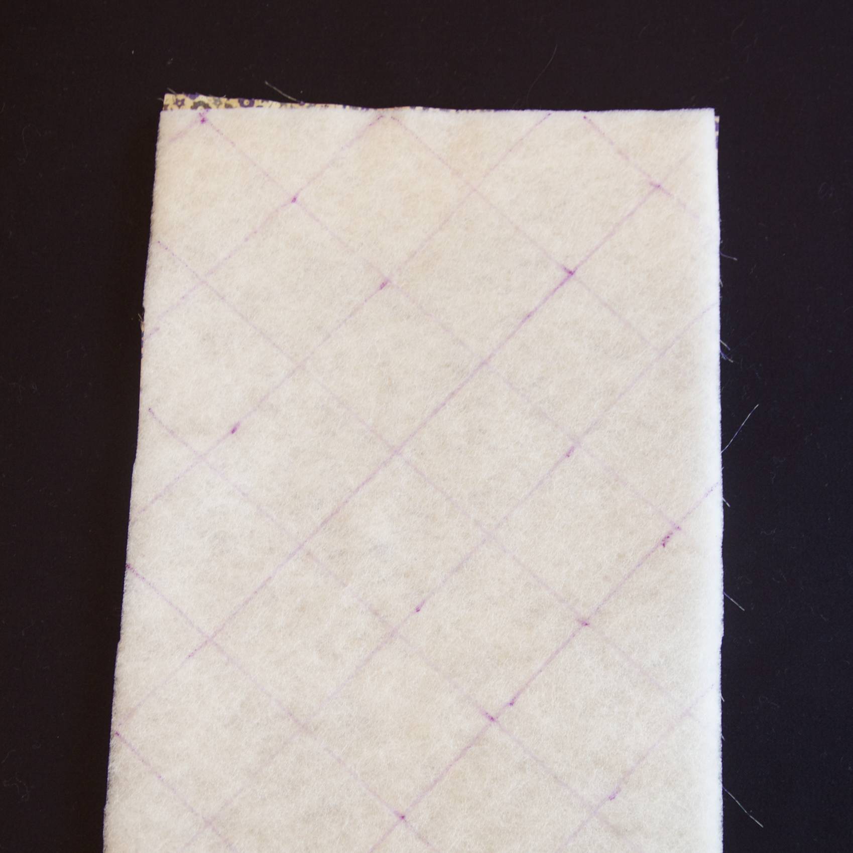 Thermocoller le molleton sur l’envers du grand rectangle (tissu 1) : poser le molleton, partie granuleuse contre l’envers du tissu. Poser une patemouille et appuyer avec le fer chaud (position coton) emplacement par emplacement (ne pas faire glisser le fer). Laisser refroidir. Puis tracer les lignes pour le matelassage avec un feutre textile (effaçable à l’air) tous les 4cm. Piquer sur les lignes.