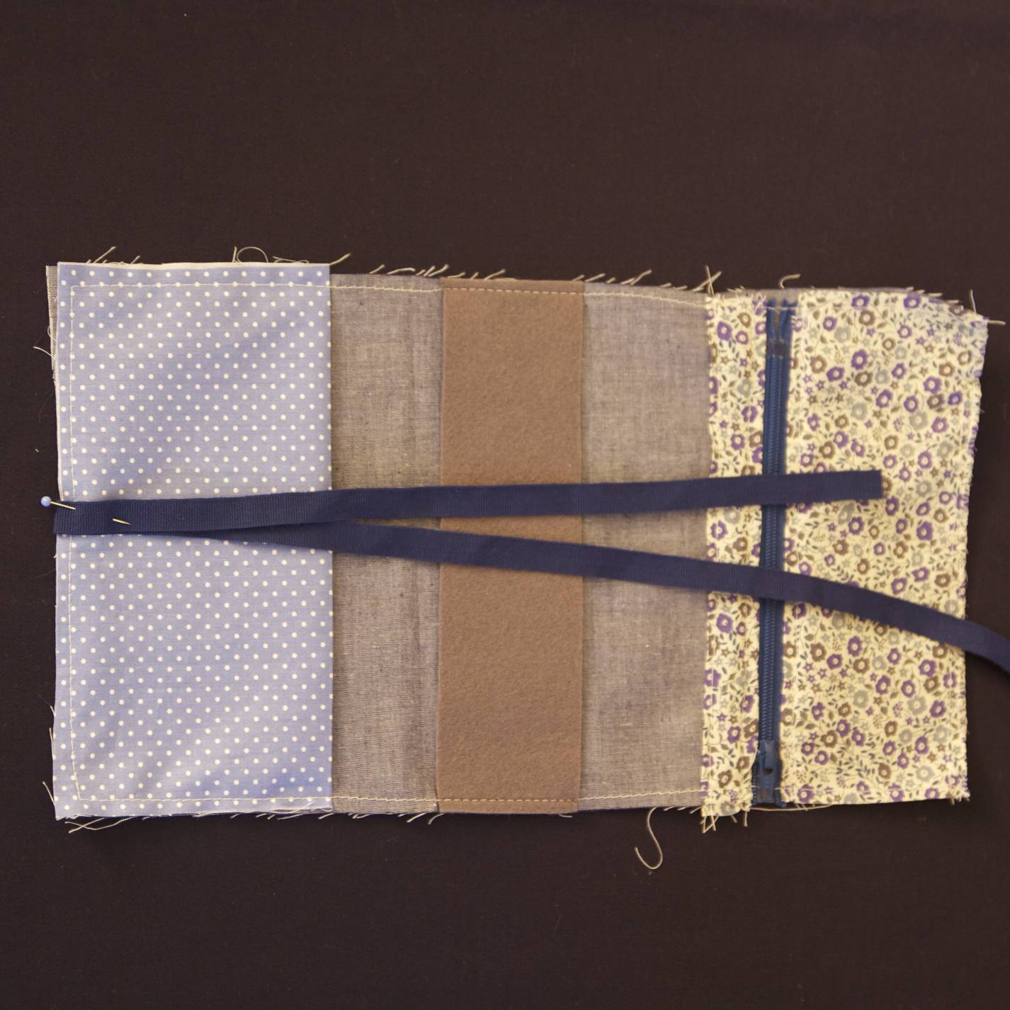 Positionner tous les éléments sur le rectangle en tissu 2 comme indiqué sur la photo. Bâtir le tour du rectangle pour maintenir tous les éléments en place.