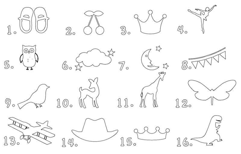 Gris :  Etiquette-Avion Rose : Etiquette-Ballerines Bleu : Etiquette-Dinosaure