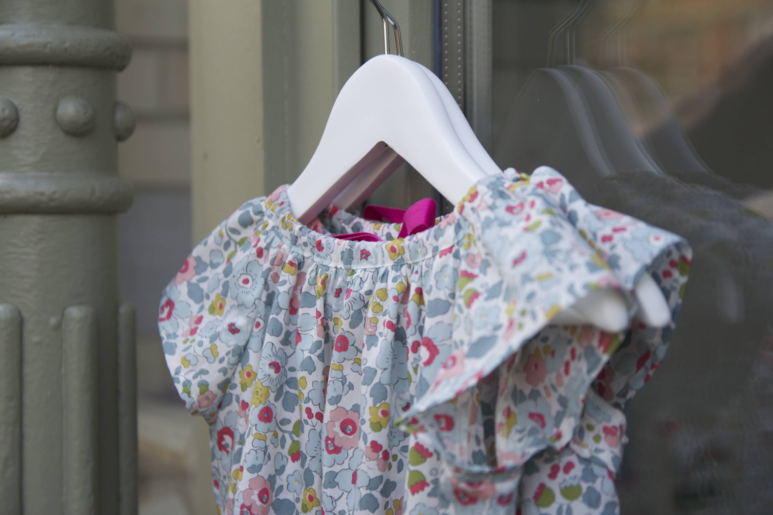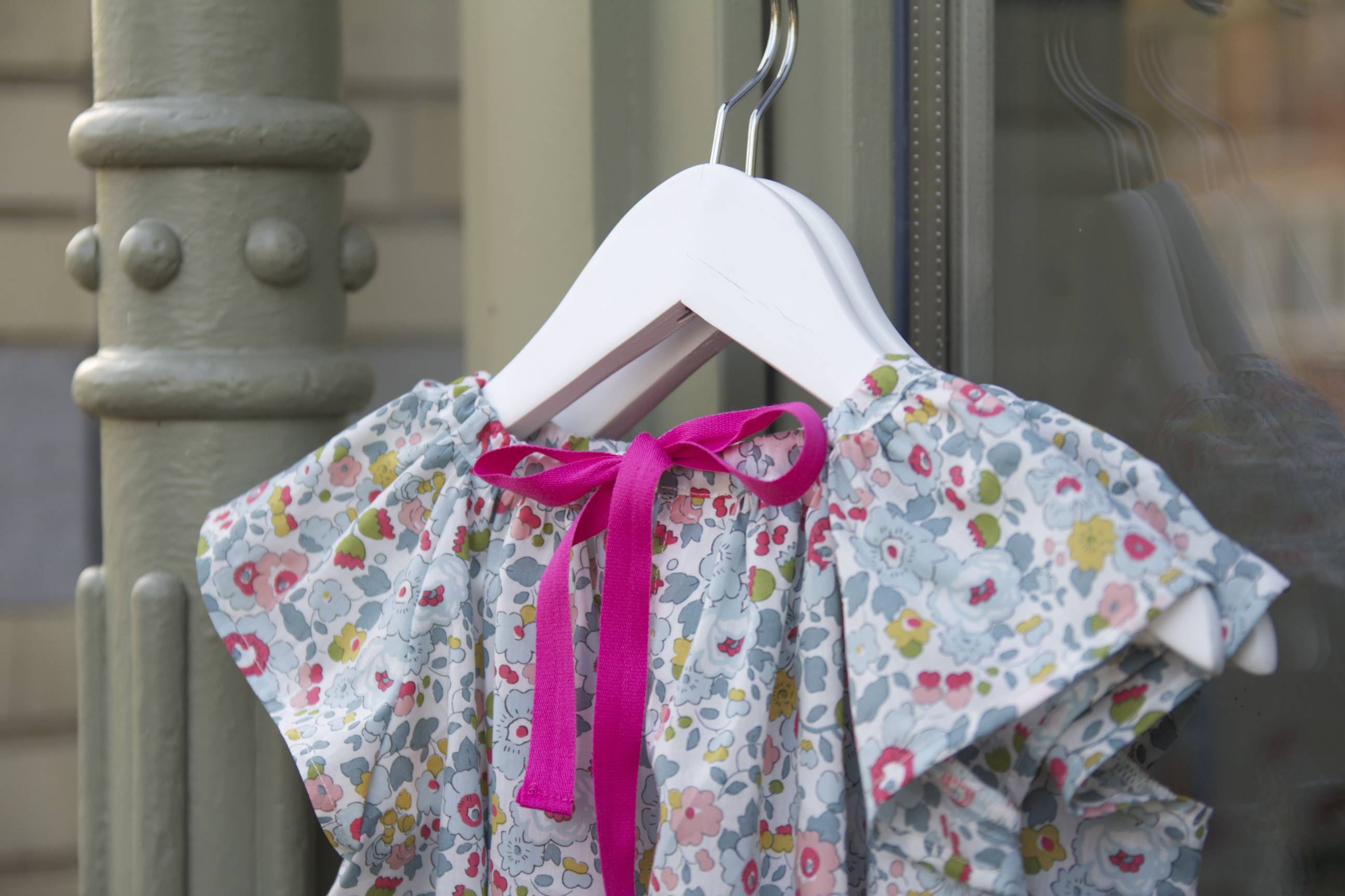 Patron de jupe pour enfant Philadelphie (2-10 ans), « c’est dimanche » modifié. J’ai coupé deux empiècements de tissu devant, « élastiqué » l’ensemble du tour de taille, rallongé la jupe et ajouté un noeud.