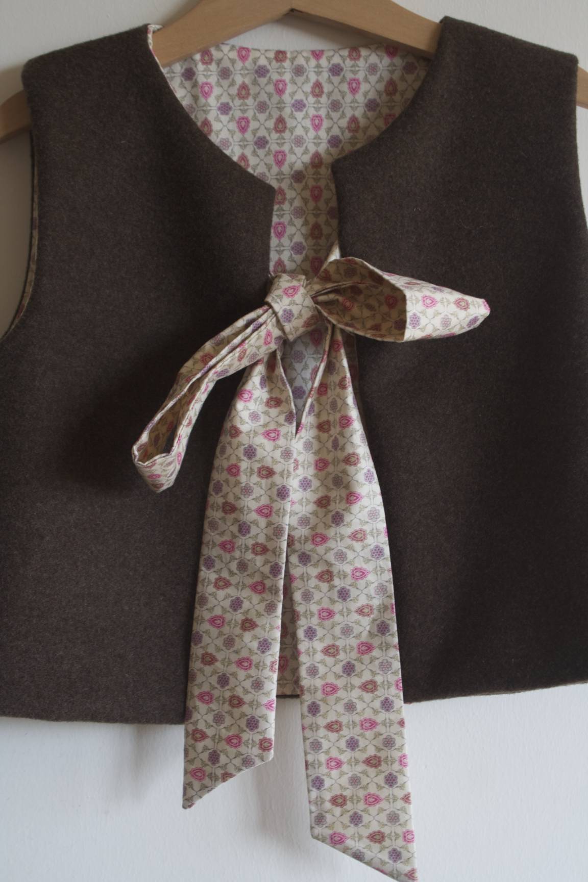 Alors quelques modèles à vous montrer bien sûr… Et pour commencer un petit gilet en lainage marron. Bientôt une version bleu marine et une version fourrure/liberty !