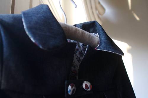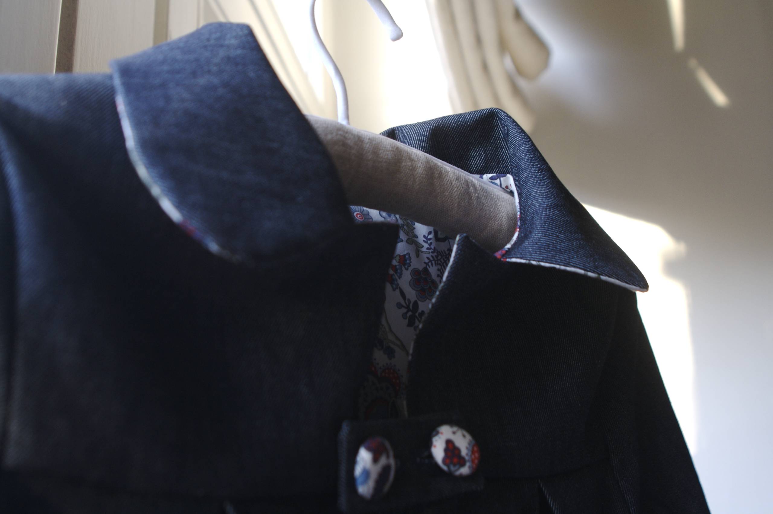 Une gabardine, deux en lainage, trois en coton,  version enfant, ado ou adulte : décidément ce patron me plaît… Et il plaît aussi beaucoup à une jeune demoiselle. Alors, parce que son anniversaire approche à grands pas, sa maman m’a demandée une vareuse en jean.